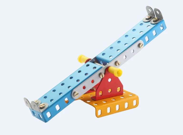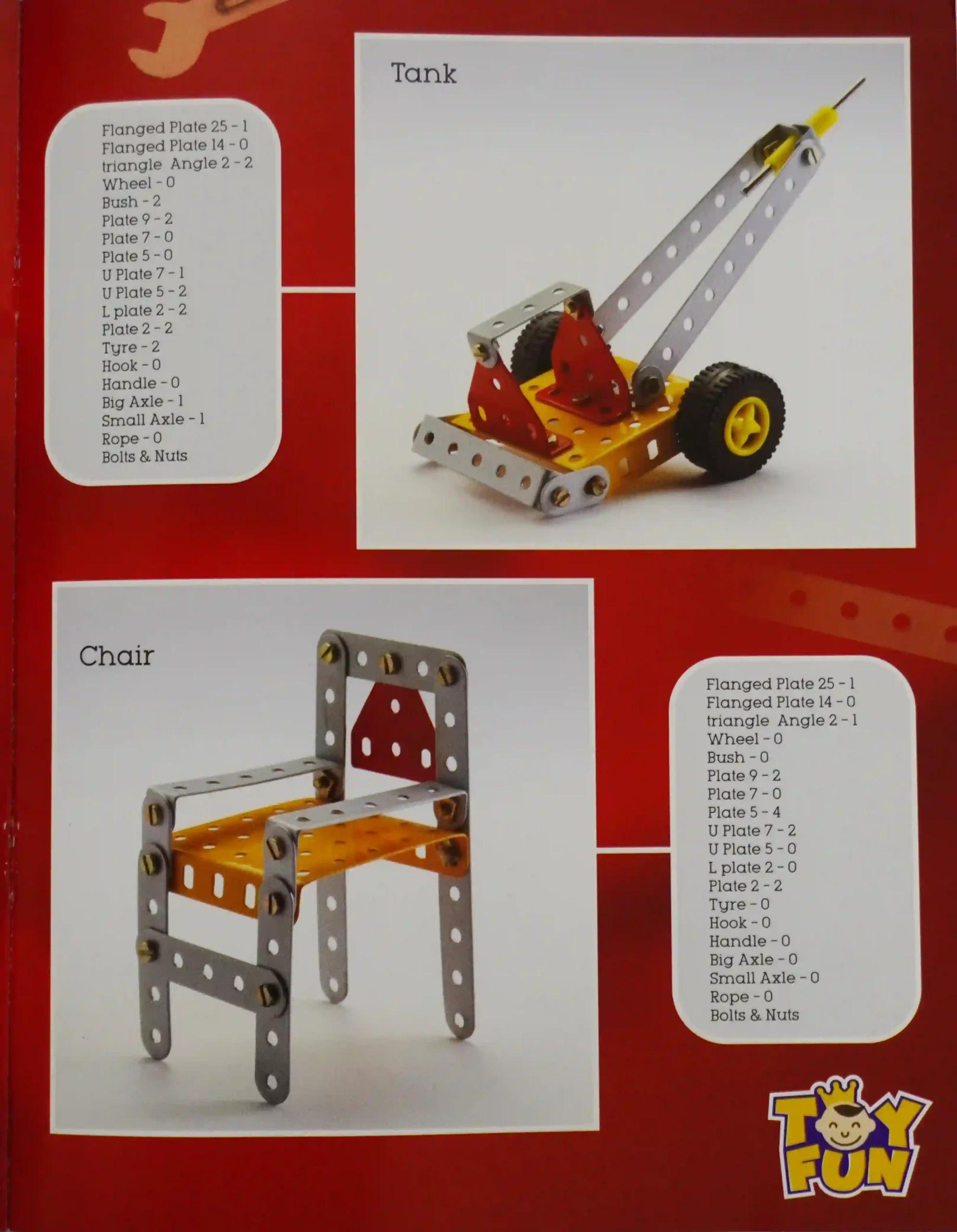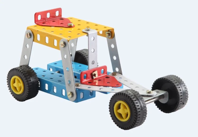Includes color-coded metal strips, base plates, wheels, nuts, bolts, axles, screwdrivers, pulleys, strings, hooks, and more. Each part is sturdy and designed for repeated use.
