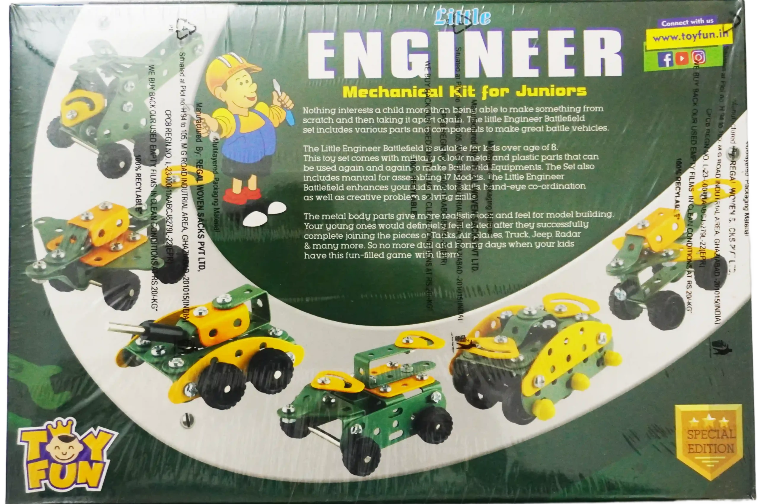 Ignite your child’s creativity and imagination with the ToyFun Little Engineer Battlefield Kit, a hands-on mechanical construction set designed for young builders aged 8 and above. With real metal and plastic parts, functional tools, and easy-to-follow instructions, this set lets kids build 17 exciting models — including tanks, jeeps, aircrafts, and radar vehicles!